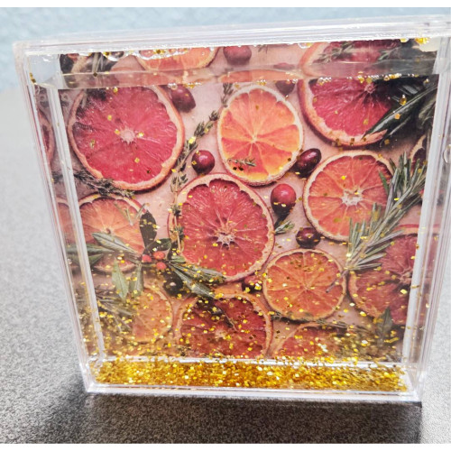 Kvadrātveida foto rāmis ar zeltā vai sudrabā spidumiem, ar Jūsu foto. Materiāls - organiskais stikls. Izmēri 110x110x30 mm,. Var ievietot 1 fotogrāfiju. Apdrukas izmērs 100x100 mm.
